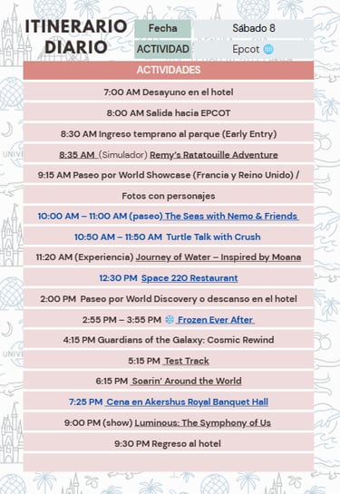 Te ayudo a planificar tus vacaciones con itinerarios claros, horarios optimizados y consejos prácticos para disfrutar al máximo de Orlando, Disney y Universal.